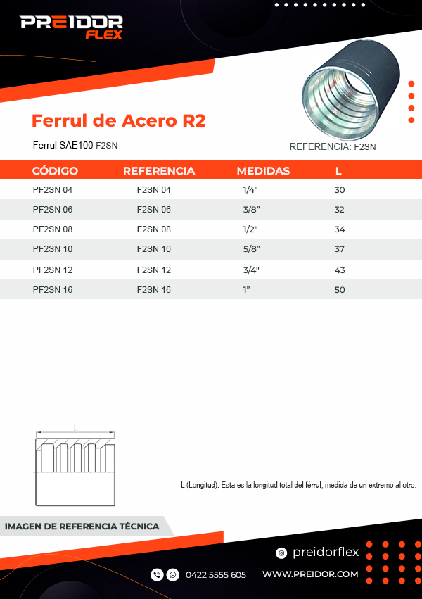 El Ferrul de Acero 2SN/R2 es el componente de seguridad para mangueras de dos mallas de acero. Este ferrule de alta resistencia está diseñado para soportar las exigencias de la alta presión, asegurando que la manguera de 3/8″ permanezca firmemente anclada al conector. Su diseño optimizado garantiza un prensado uniforme y una durabilidad excepcional, cumpliendo con los estándares SAE 100 R2 y EN853 2SN.